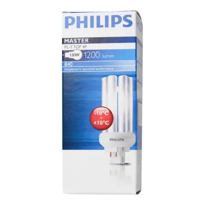 Philips PL-T TOP 18W 840 4P providing light at a colour temperature of 4000K, which corresponds to a cold white light. The colour rendering index is also excellent, more than 80Ra. Philips PL-T TOP 18W 840 4P are very energy efficient: their energy label is classified A. Philips PL-T TOP 18W 840 4P lamps also have a very long lifespan, 13000 hours on average!